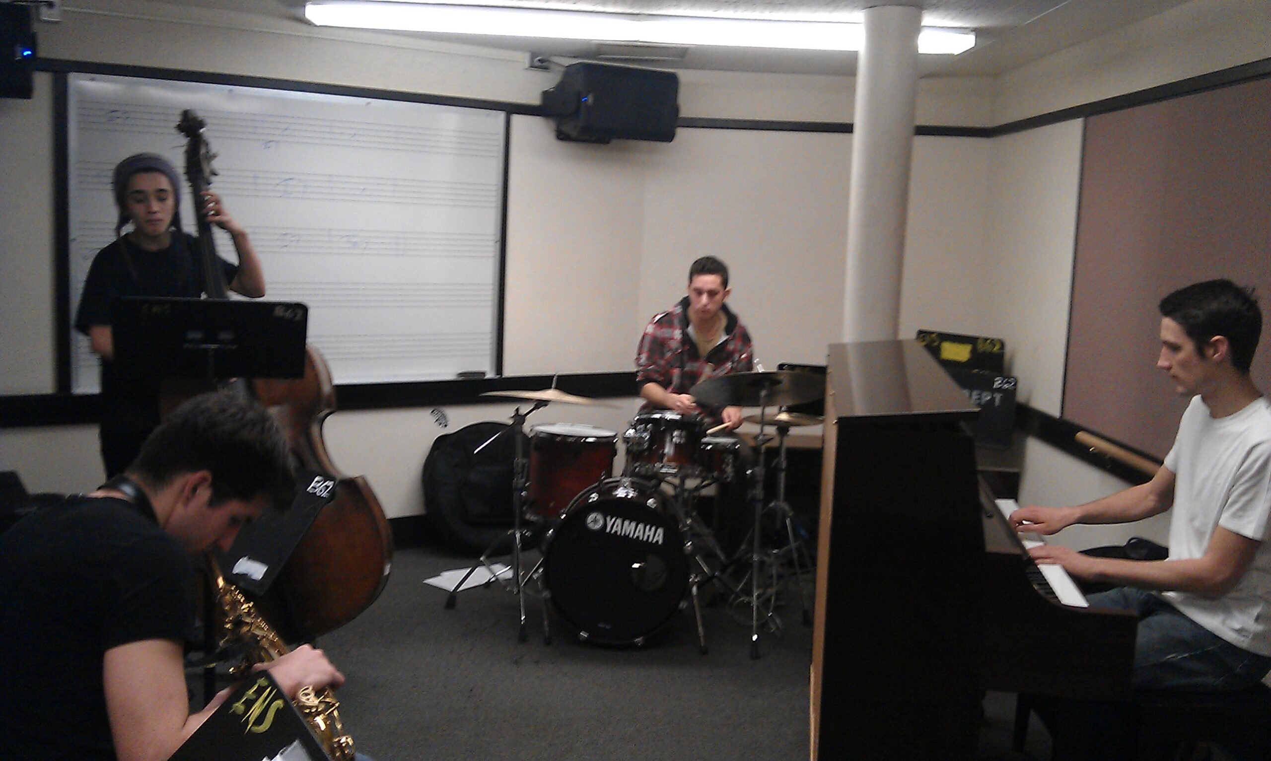 Het bijhouden van een blog is makkelijker gezegd dan gedaan. Het onderhouden van vrienden en familie (en vage kennissen 😉 … ) is al een vak apart… Zoals men voorspelde had ik na een maand last van “homesickness”… En dat had ik nog niet eerder meegemaakt. Maar goed dat ik ook nog eens griep had en dat weekend lekker in bed kon blijven – facebook te chekken en te zwijmelen over mijn stad Leiden waar iedereen op de gracht kon schaatsen… Goed, ik heb het overleefd, ik zit hier goed op mn plek en ben dus flink aan de studie. Ze houden me hier de hele dag bezig. Ik heb erg veel lessen. Core-classes met theorie, zo moet ik bijvoorbeeld voor “arrangeren” een stuk schrijven voor een band met ritme sectie en vijf blazers waarna we dat dan halverwege het semester in de studio mogen opnemen. Overdag heb ik dus lessen tussendoor jammen met mensen, savonds extra repetities, naar concerten en huiswerk maken.