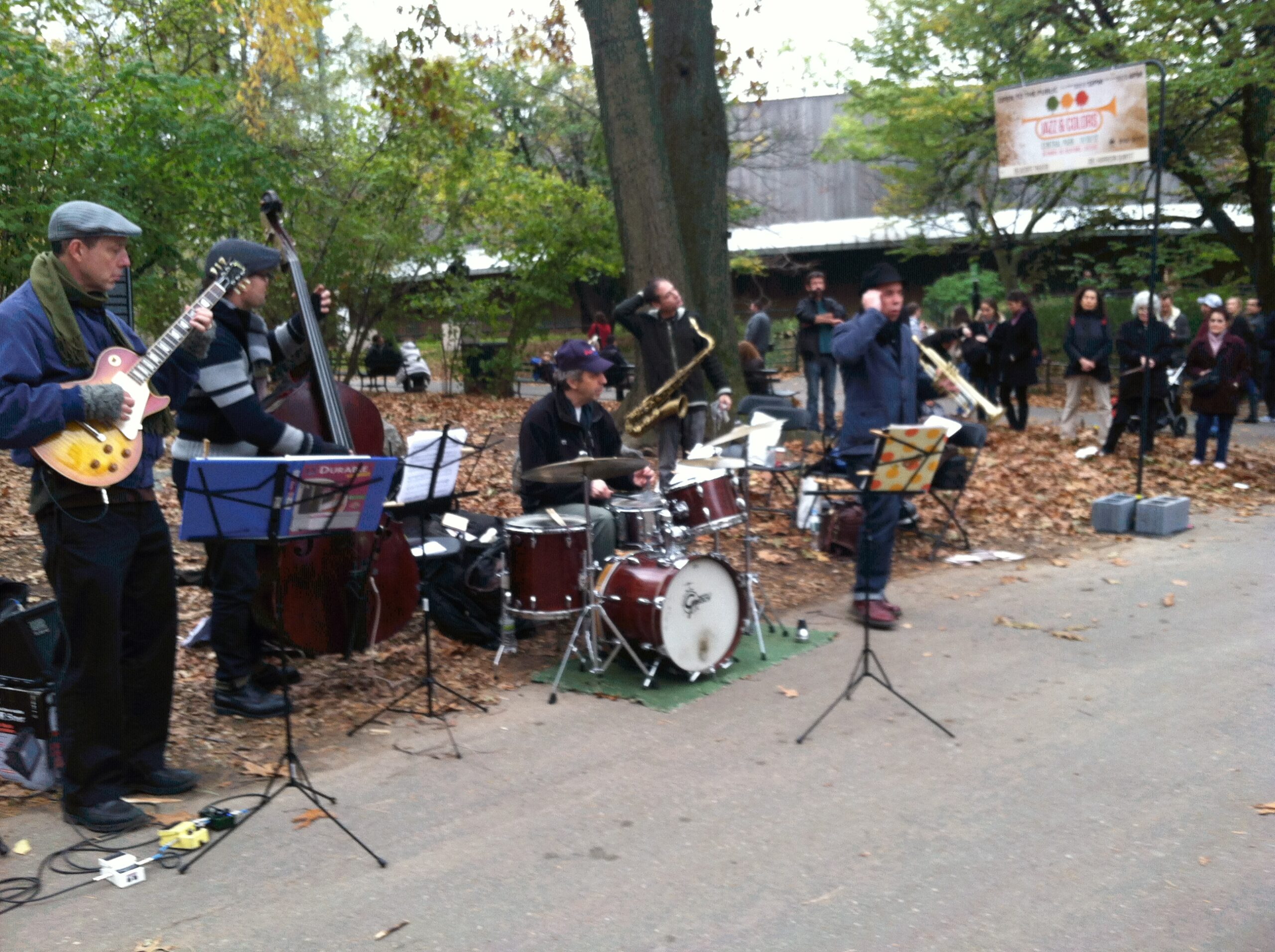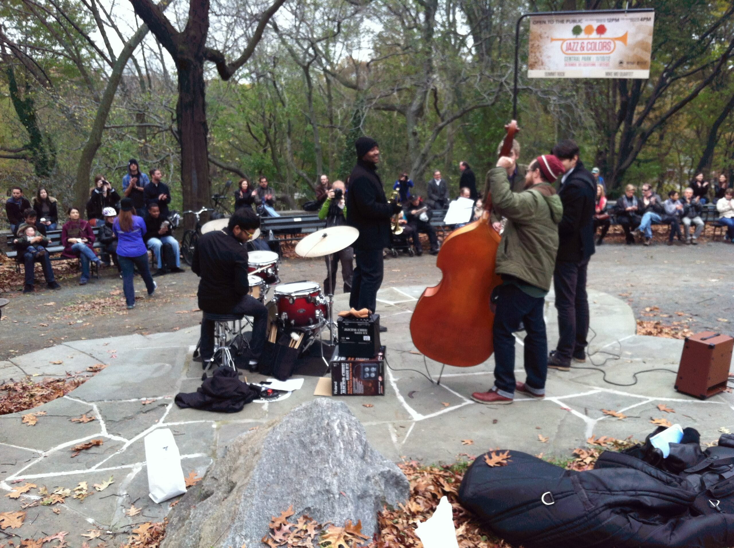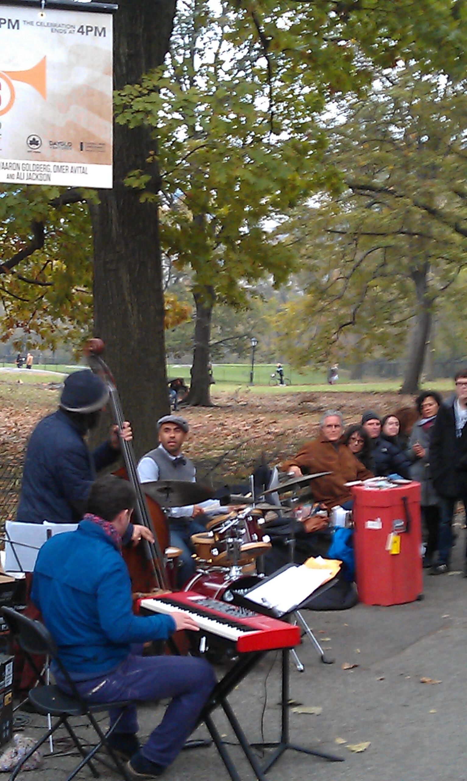 De volgende ochtend moest ik vroeg op – rond 1130 had ik lunch met Ashley Kahn in gastronomie, een delicatesse zaak met kaas en charcuterie. Ashley Kahn is iemand die de hele jazz scène kent, hij werkt boor NYU en heeft de biografie van Coltrane geschreven (Love Supreme). Daarnaast heeft hij geschreven voor verschillende jazz magazines en kranten. Ik had Joanna uitgenodigd en Ashley had Massimo Chioccia uitgenodigd, een schilder uit Italië, die een expositie heeft met zijn jazz-georienteerde schilderijen in Birdland. ( Zijn website) Het was een interessante en relaxte middag. Na uitgebreid gegeten te hebben liepen we naar Central Park, daar was een festival: “jazz and colors” ter ere van de herfst. Wel dertig jazz bands speelden verspreid over het park en we hadden een superleuke wandeling. Aaron Goldberg speelde ook, en na zijn concert heb ik hem nog even gesproken…