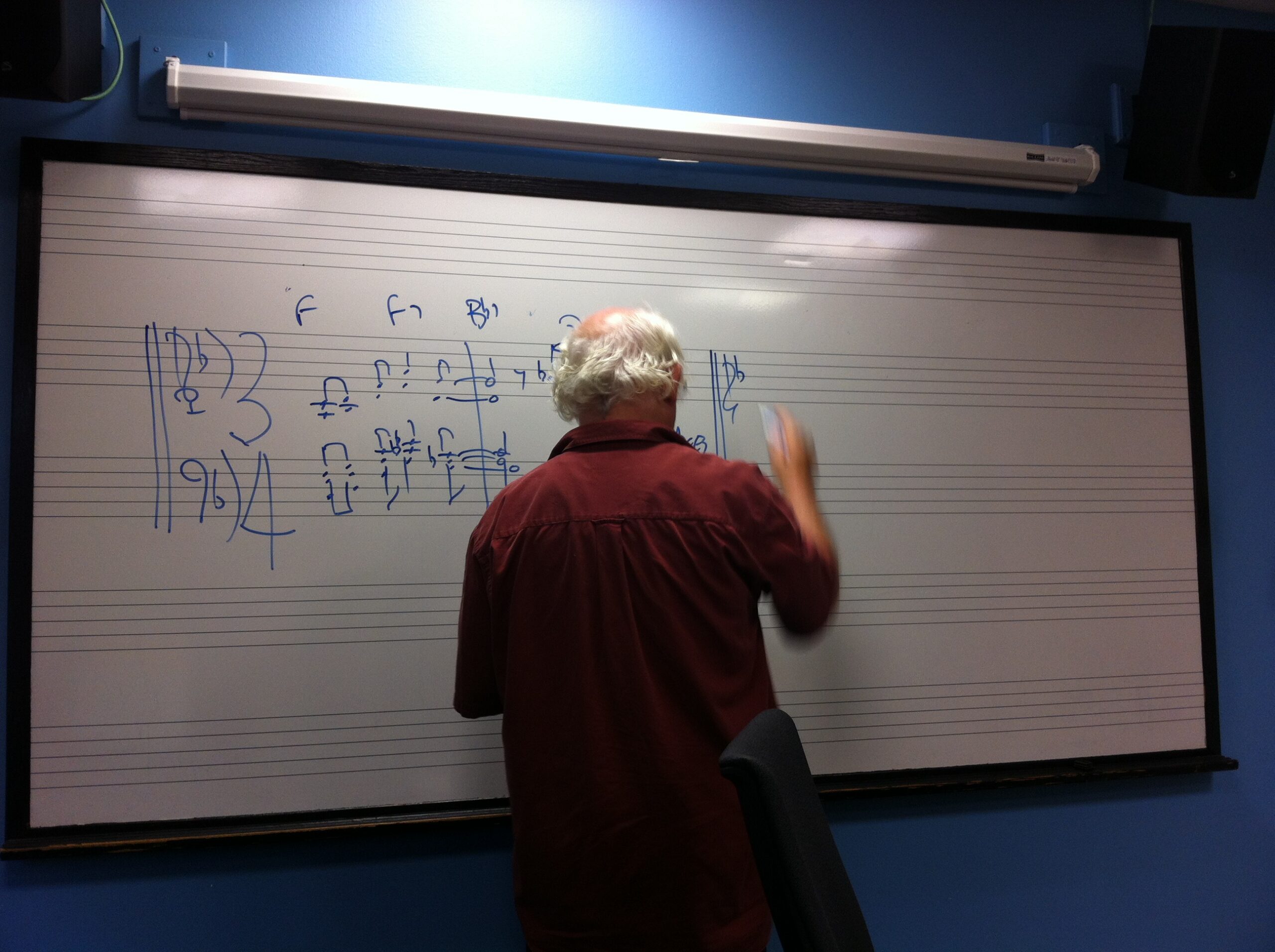 Dit semester volg ik weer een vak bij hem: ‘Advanced arranging for large ensemble’. Dit vak komt nadat je geslaagd bent voor het vak Bigband arrangeren, wat ik vorig semester heb gevolgd (bij Dick Lowell). In deze context is een large ensemble is dus wat groter dan Bigband, en zou dus ook strijkers kunnen hebben. Wat we gaan doen bij dit vak is heel veel bigband muziek bestuderen. Daarnaast gaan we componeren in de stijl van Duke Ellington, Gil Evans. En deze composities zullen we dan arrangeren voor de Bigband/large ensemble. Hierbij een foto van Greg waarbij hij een van zijn “Duke-isms” op het bord schrijft, deze gaat over blue note voicings 🙂