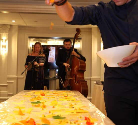 At the Zur Heide Gourmet Festival in Düsseldorf, we created a 40 m² edible musical pastry painting — chocolate, cake, gel and flowers — while improvising live, and served it to 1,500 people.